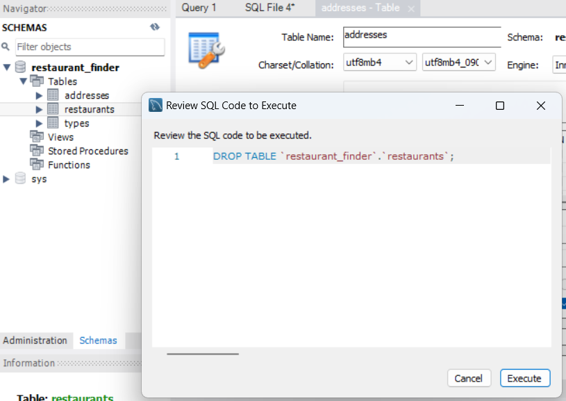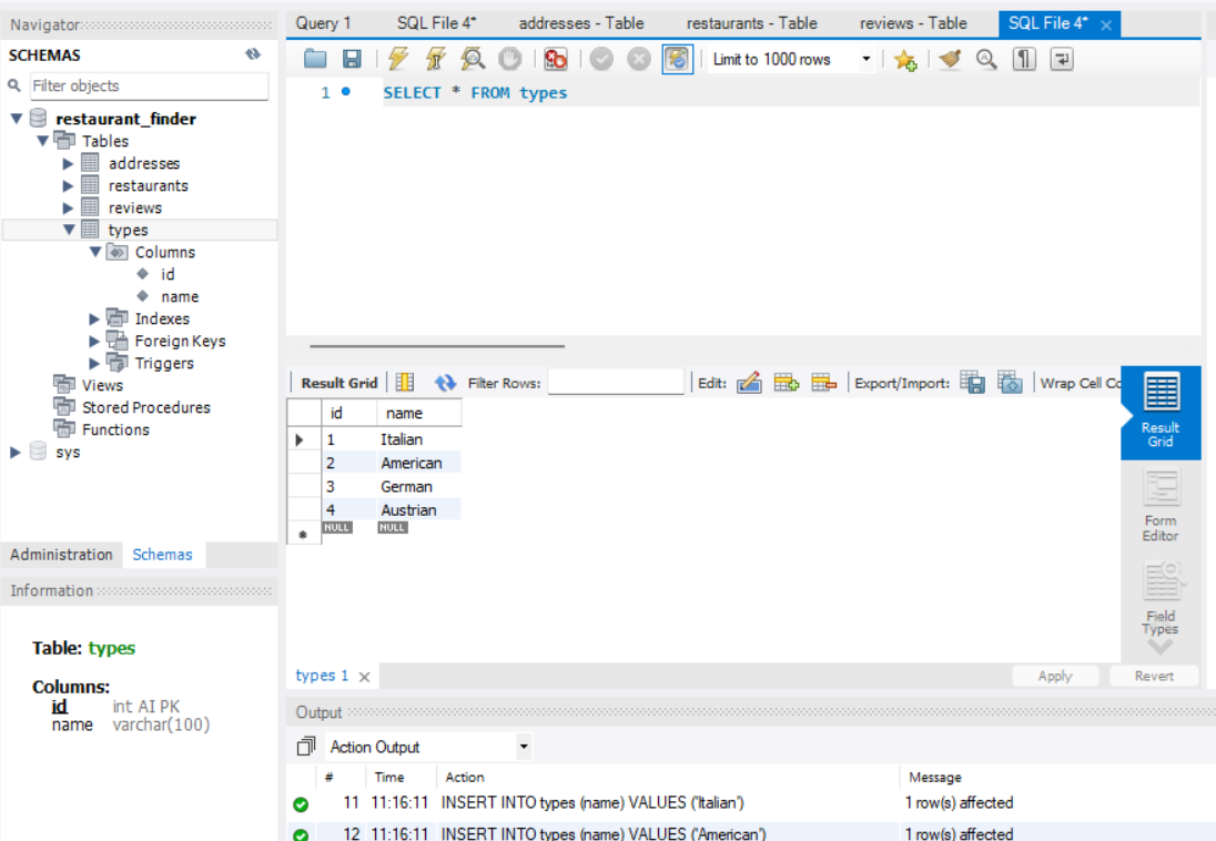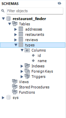앞에서 우리는 addresses와 types라는 테이블을 생성해주었고,