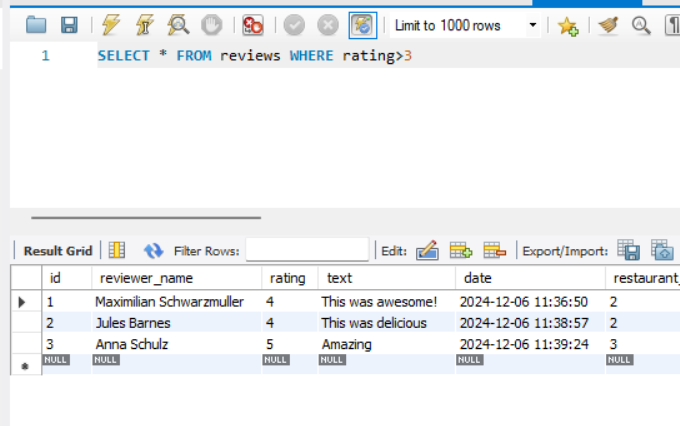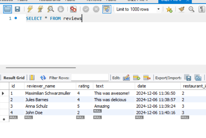 INSERT INTO reviews (reviewer_name, rating, text, restaurant_id) VALUES(