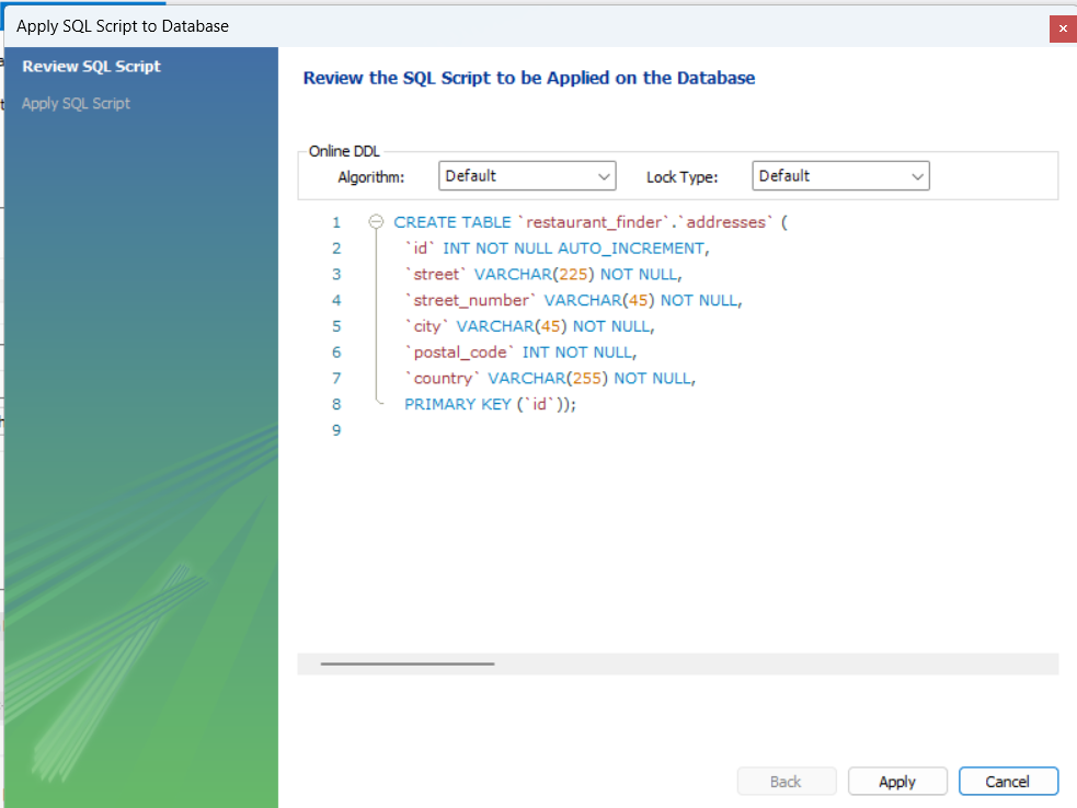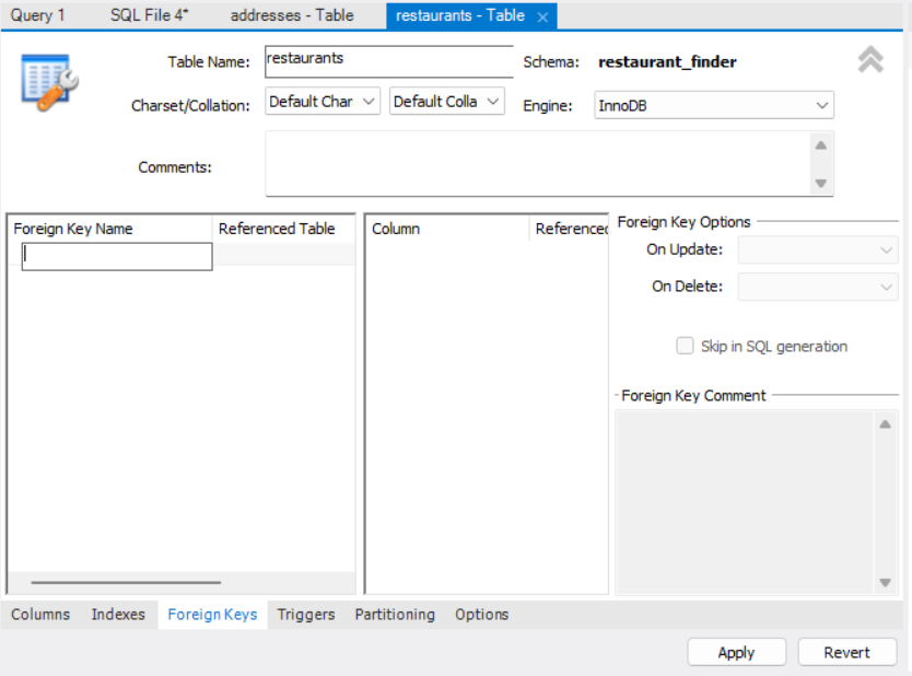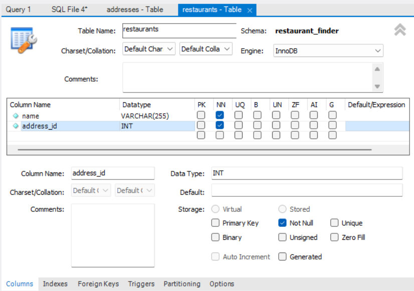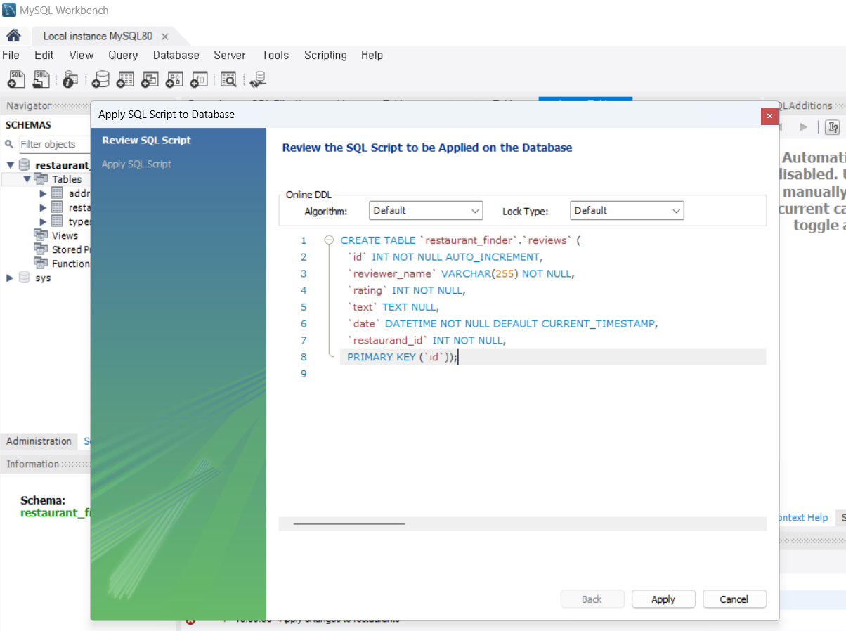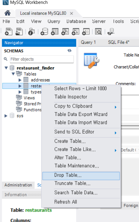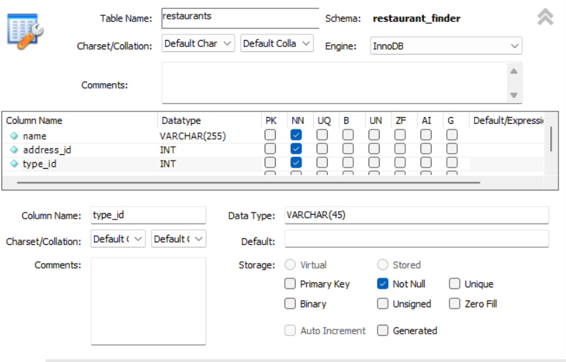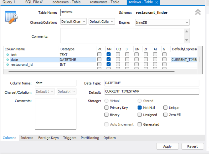 그래서 새로만든 restaurant table은 다음과 같은 DDL로 만들어진다.