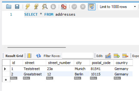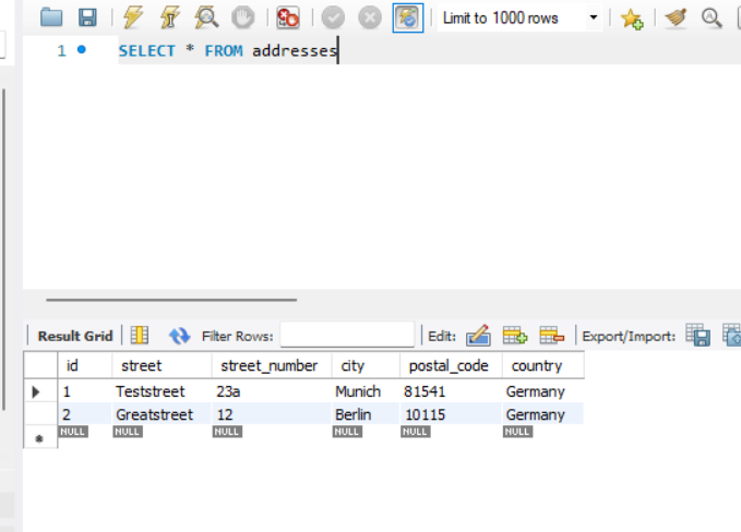 INSERT INTO addresses (street, street_number, city, postal_code, country) VALUES (